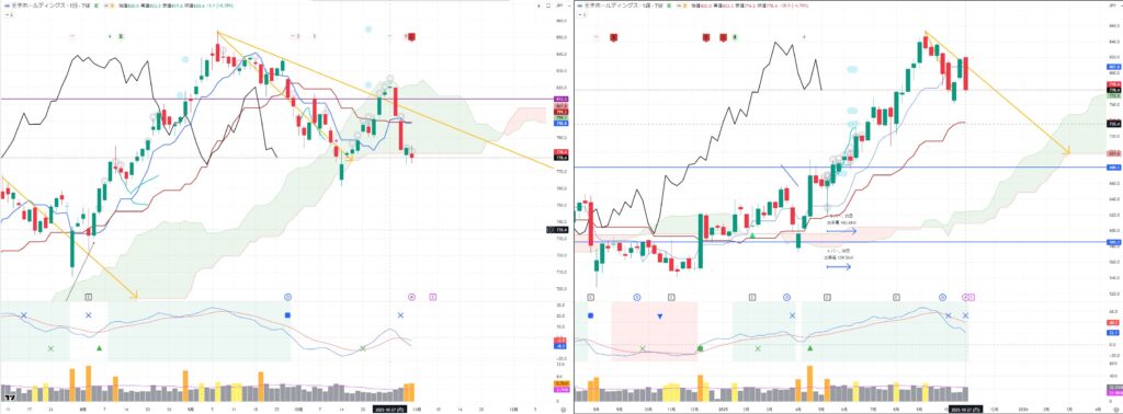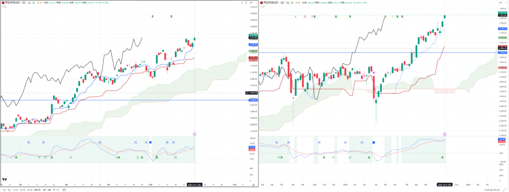 ⇒ショートを外してロングを維持。11/04 1800円をまず目標値と予測しておく。