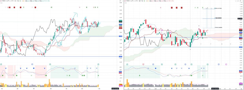 ⇒打診をホールド中。基準線付近で微妙なところ。週足から見ると一時的に下げる可能性の方が高いか。