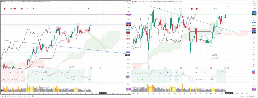 ⇒ホールド中。11/14 1080円を予測しておく。安値を下回るとロスカット予定。