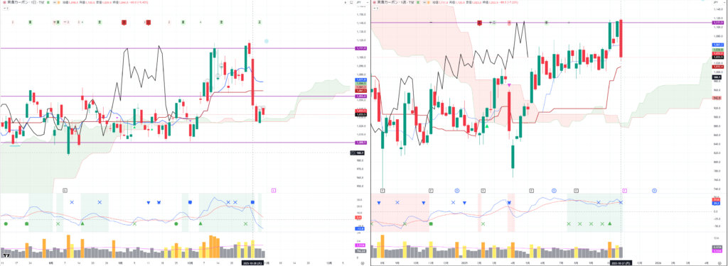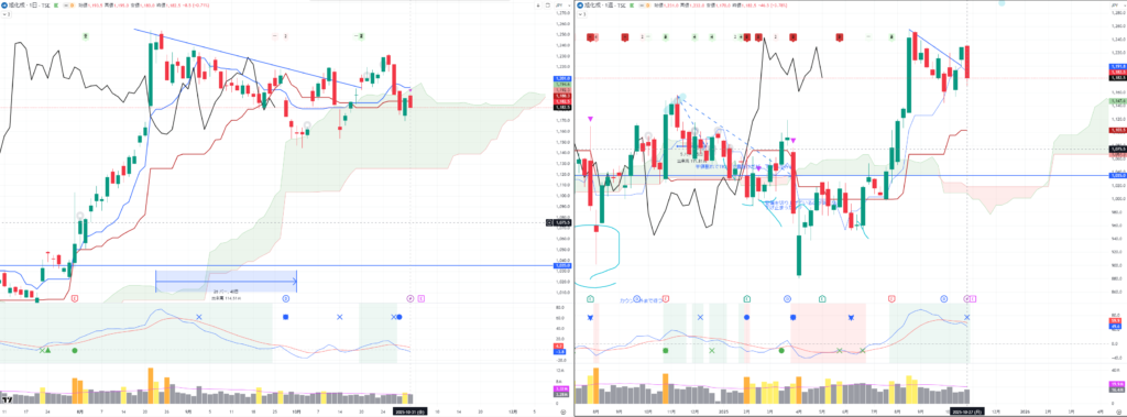 形が良かったため、急遽エントリー。(一目もみ合い離れ、週足緑三角)