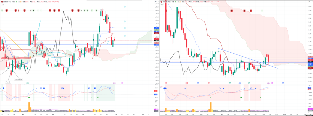 ⇒先週の気になる銘柄をエントリー。買ってすぐ大きく上げて週足水平線、計算値到達したので、一部ヘッジ中。下げたら再ロングする予定。