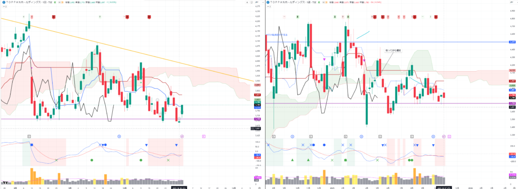 上昇6か月、高値を切り下げ、日足青丸で弱いところを配当落ちでエントリー、陽線つつみで利確。