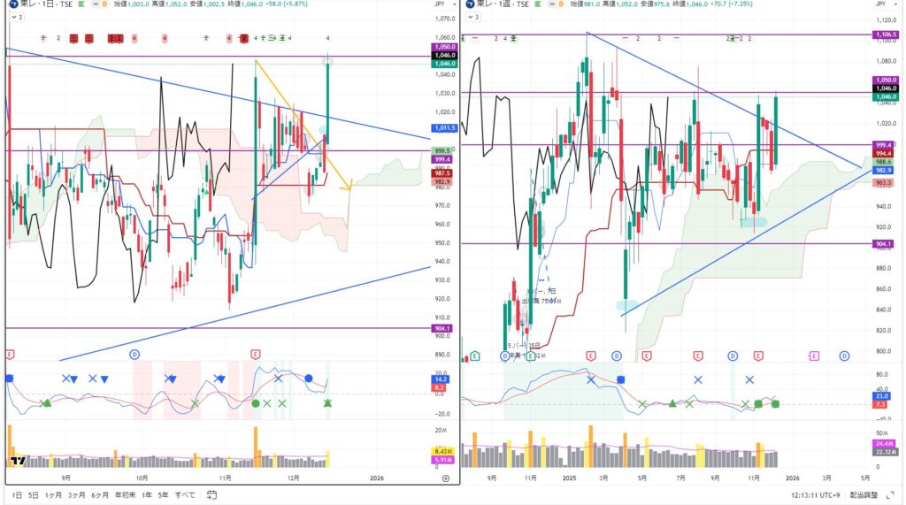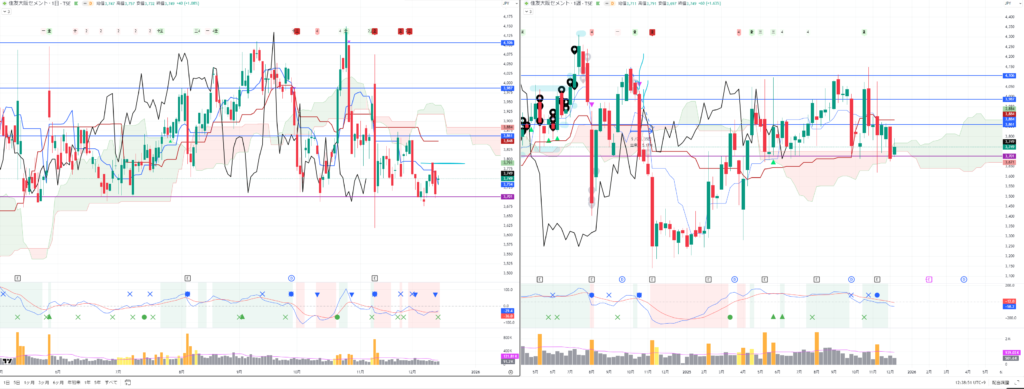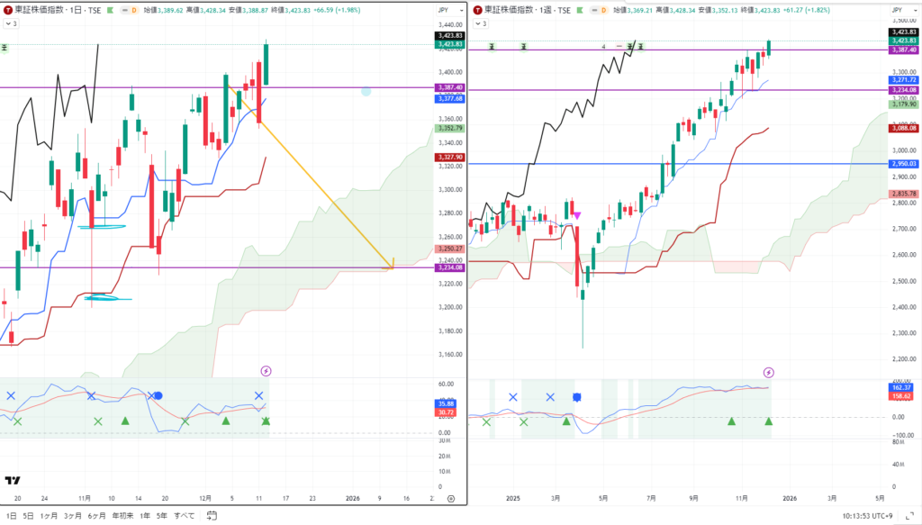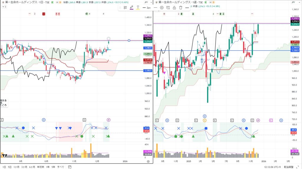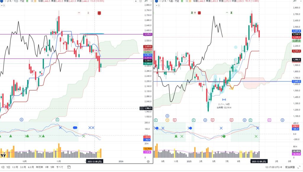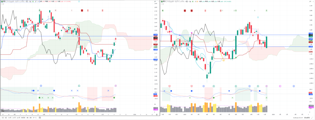 いずれも週足の転換線ではじかれて反発しており、週足転換線が割られると危険。
