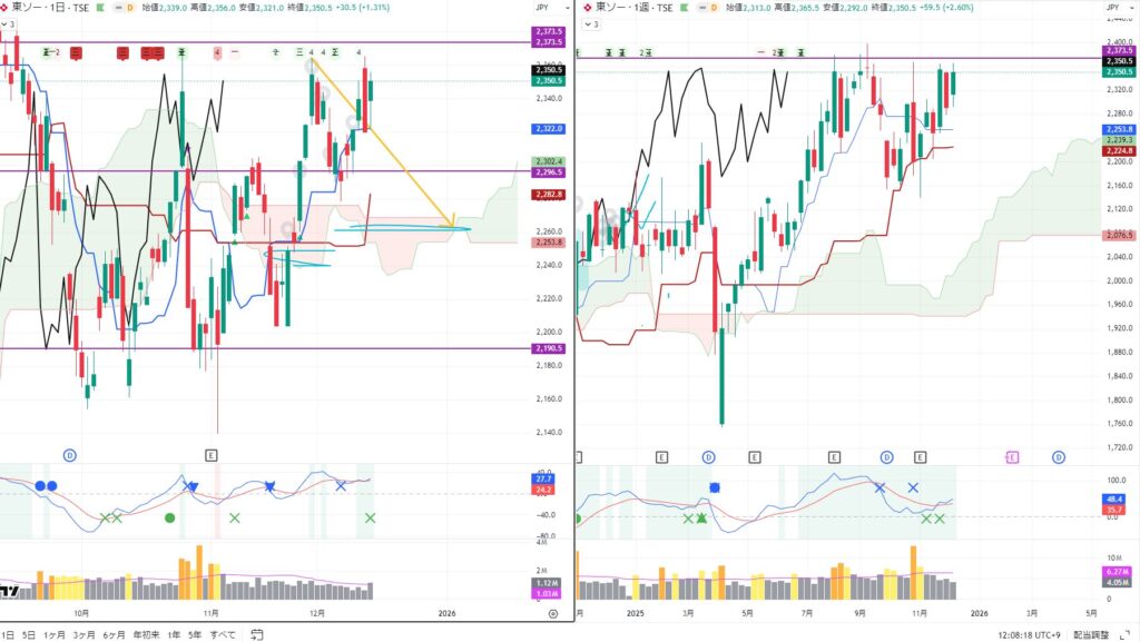 ⇒押してきたのでエントリー候補。12/12 2100円に向かうと予測しておく。