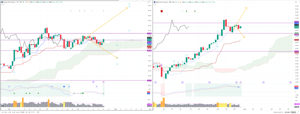 来週月曜日は上から始まりそうが、週足転換線の50365円上でキープできれば、もう一度上げる可能性がある。