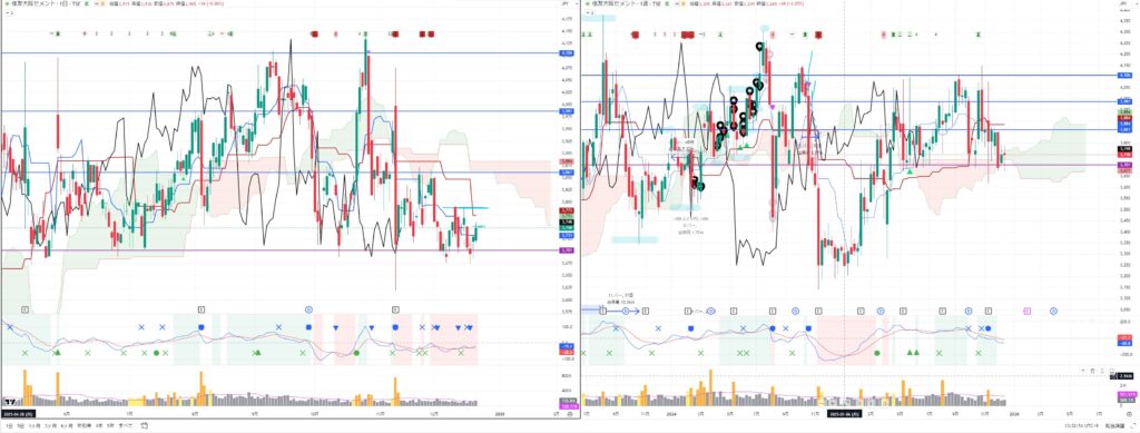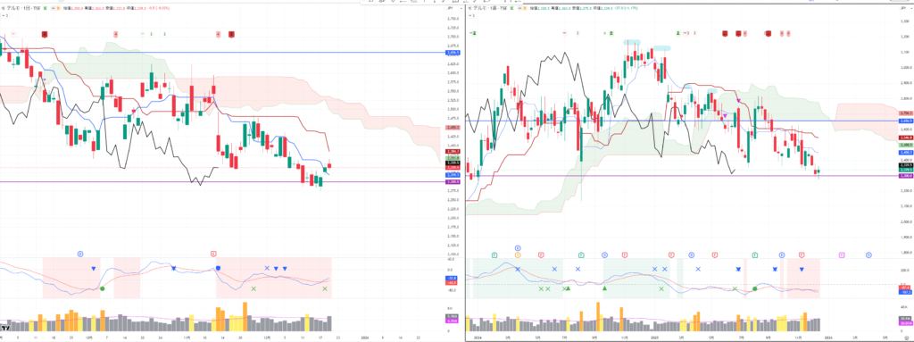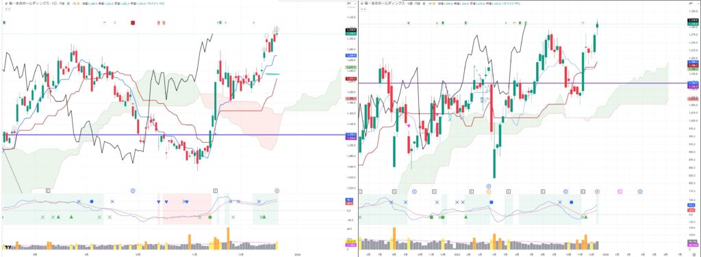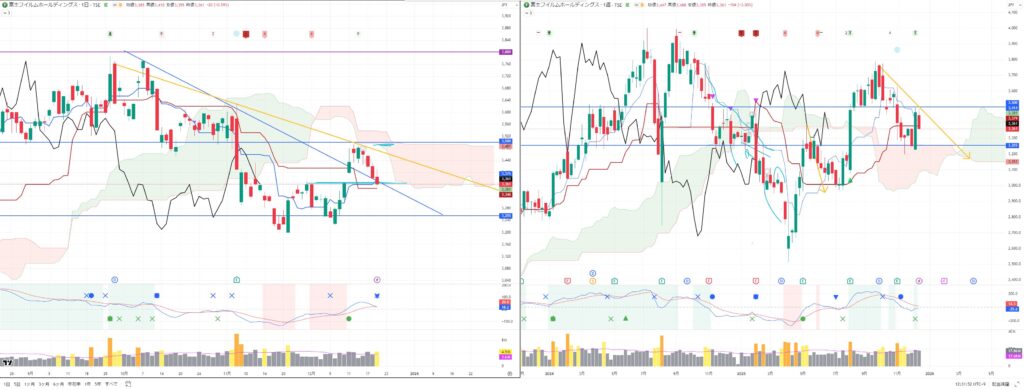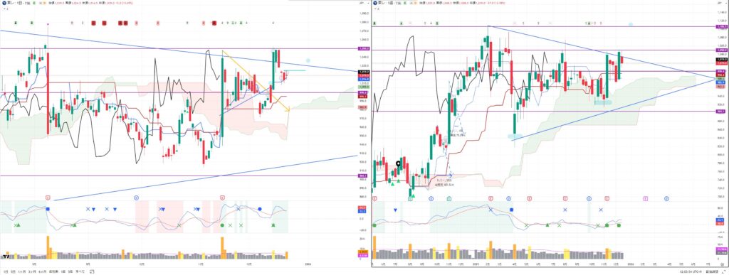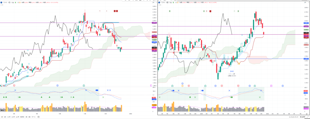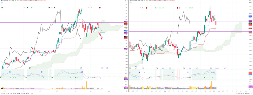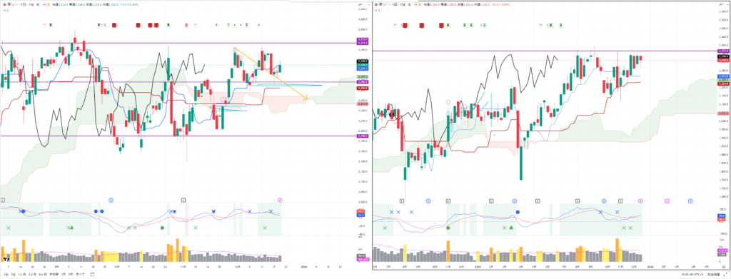 いずれも週足の転換線ではじかれて反発しており、日経平均は週足転換線を一時的に割り込んでおり注目です。